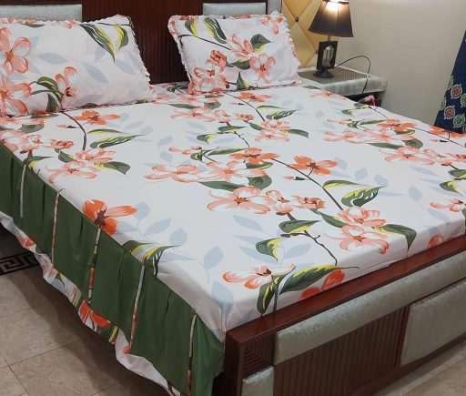 Transform your bedroom into a haven of elegance and comfort with our exquisite 3-piece pure cotton stitched 2-sided frill bedsheet set. Crafted from premium quality cotton, this bedsheet is designed to offer unparalleled softness and breathability, ensuring a restful night’s sleep.