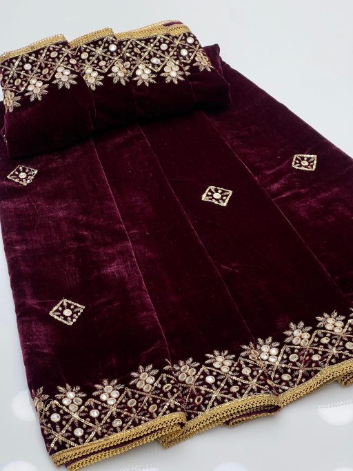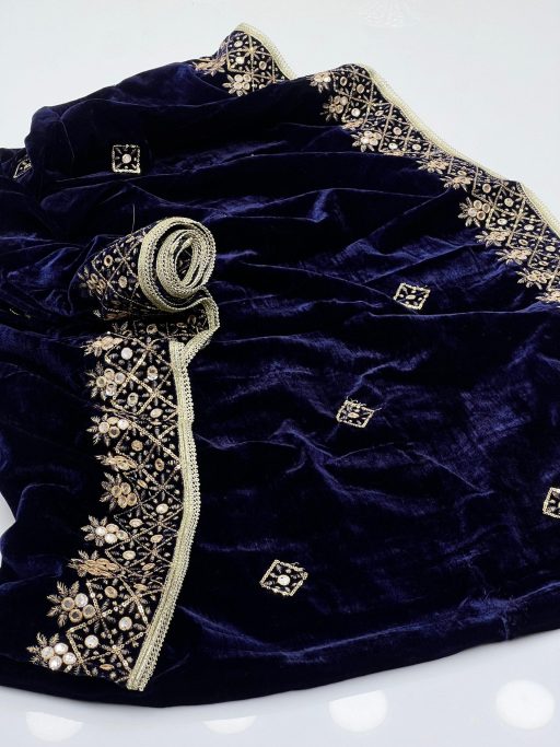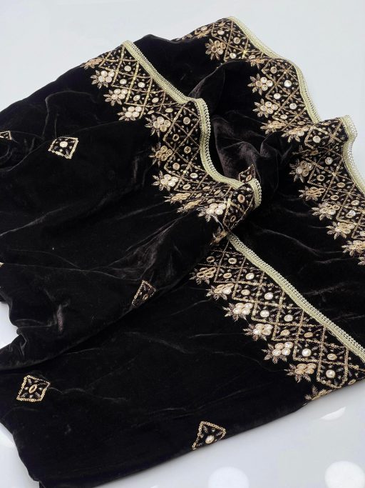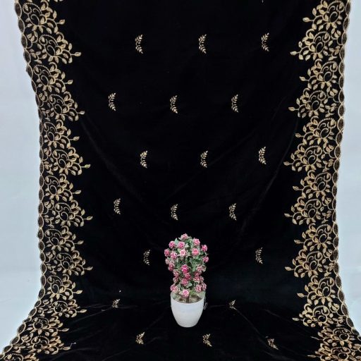 Step into elegance with our Velvet Shawl, meticulously crafted to add a touch of luxury to your wardrobe. This stunning shawl is beautifully embroidered with machine-sequenced patterns using high-quality Tilla thread, creating a rich and intricate design. The soft velvet fabric drapes gracefully, adding sophistication and warmth to your outfit. Perfect for weddings, parties, or any special event, this shawl becomes an essential accessory for those seeking style and elegance. Its unique combination of craftsmanship and high-quality materials ensures it will be a cherished addition to your collection.
